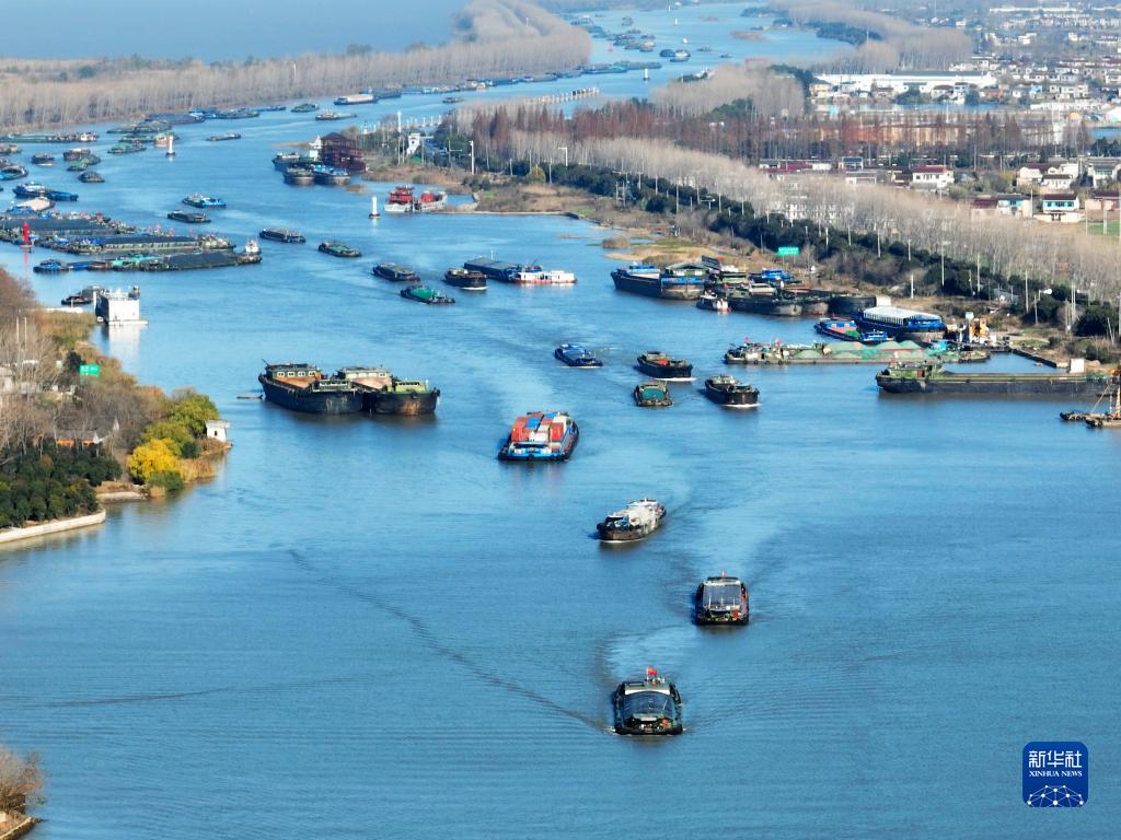 入冬以來(lái),在京杭大運河江蘇揚州段,裝載煤炭、鋼材、建材等貨物的船舶在航道上有序航行,來(lái)往如梭,運河上呈現一派繁忙景象。