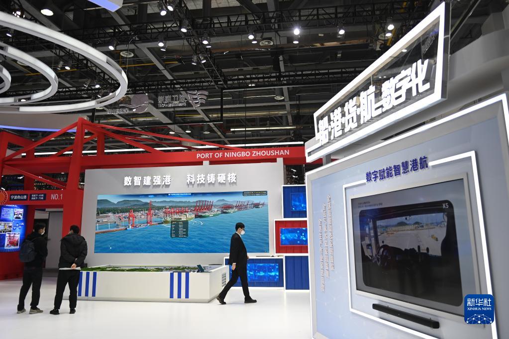 12月19日,觀(guān)眾在浙江省海港集團展區觀(guān)看寧波舟山港的數字可視化系統。