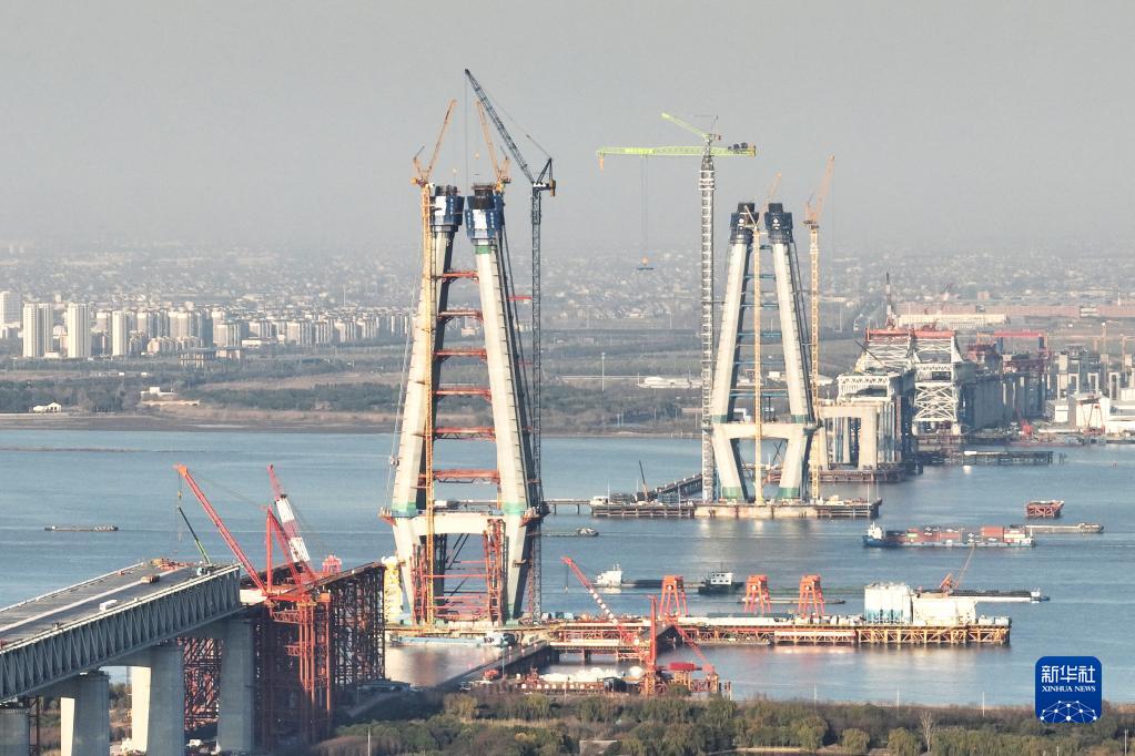 12月19日,常泰長(cháng)江大橋主塔施工如火如荼(無(wú)人機照片)。