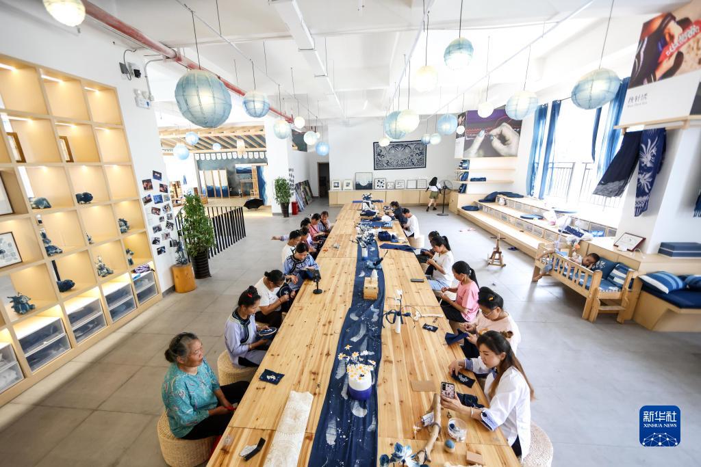 6月23日,在貴州省黔東南苗族侗族自治州榕江縣特和社區“母親回家手工坊直播中心”內,主播與繡娘一起直播刺繡技藝。