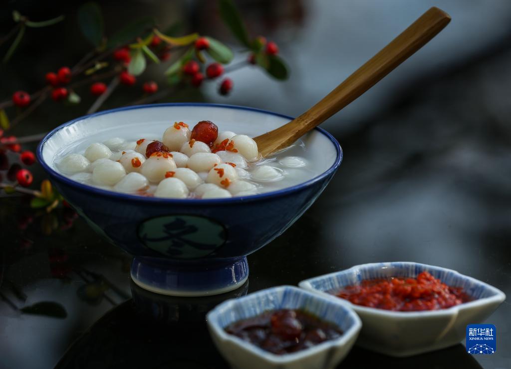 12月17日,在福建省武夷山市,人們在吃湯圓時(shí)放上一勺桂花金桔蜜,寓意新的一年生活甜蜜,富貴吉祥,團團圓圓。