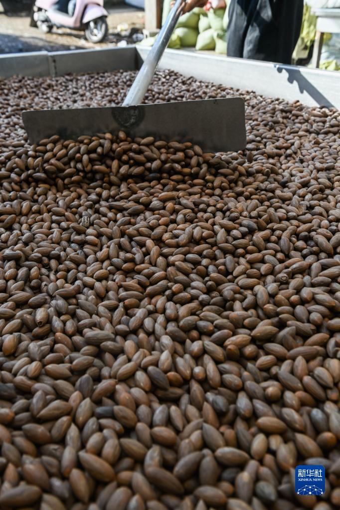 12月21日,在諸暨市趙家鎮趙家社區趙三自然村的一家香榧加工點(diǎn),工作人員攤晾剛炒好的香榧。