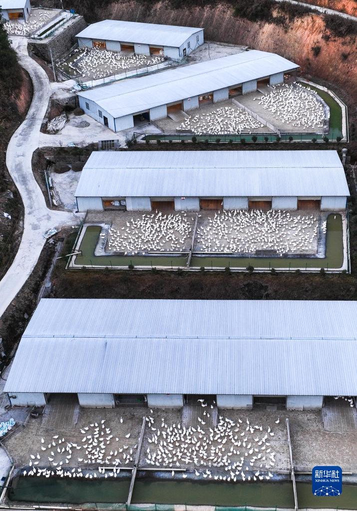 這是12月19日拍攝的貴州省錦屏縣銅鼓鎮馬臺生態(tài)種鵝養殖基地(無(wú)人機照片)。