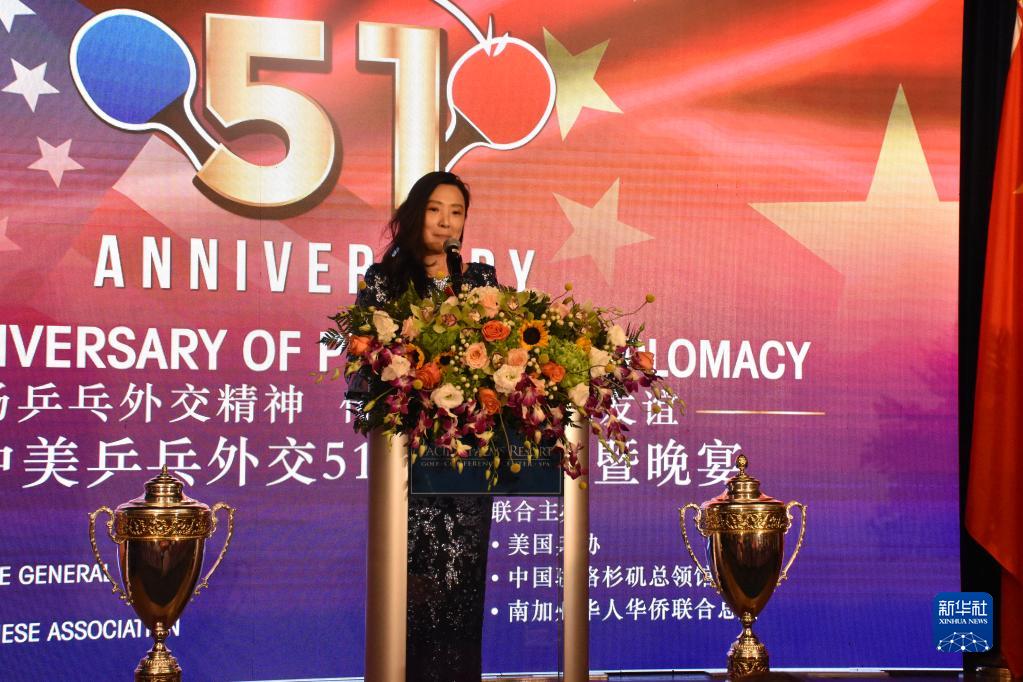 由美國乒乓球協(xié)會(huì )、中國駐洛杉磯總領(lǐng)館和美國南加州華人華僑聯(lián)合總會(huì )聯(lián)合主辦的紀念中美“乒乓外交”51周年論壇暨晚宴20日在加利福尼亞州洛杉磯舉行。