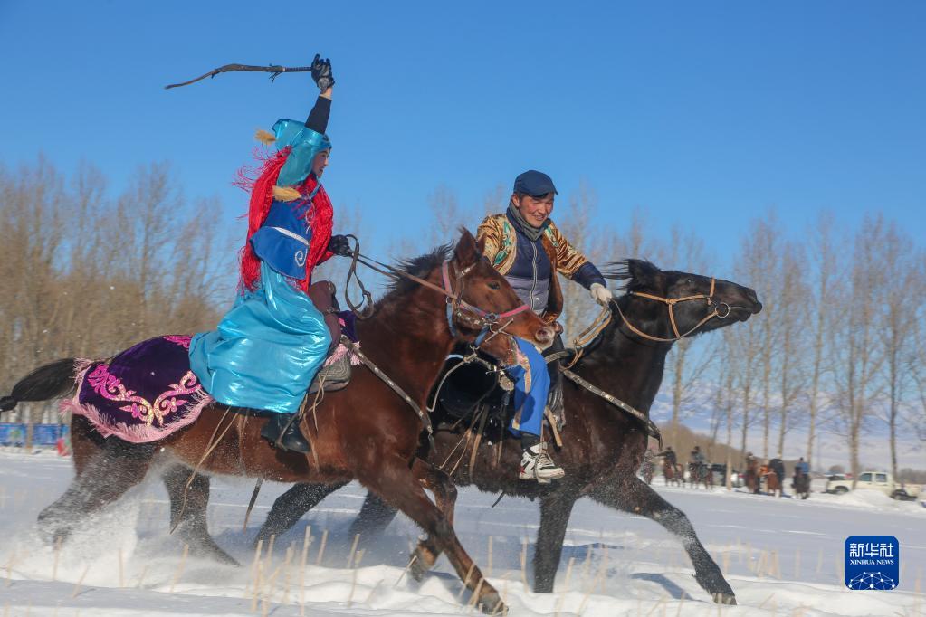 在昭蘇縣薩爾闊布鄉一處雪原上,當地農牧民進(jìn)行“姑娘追”活動(dòng)(12月21日攝)。