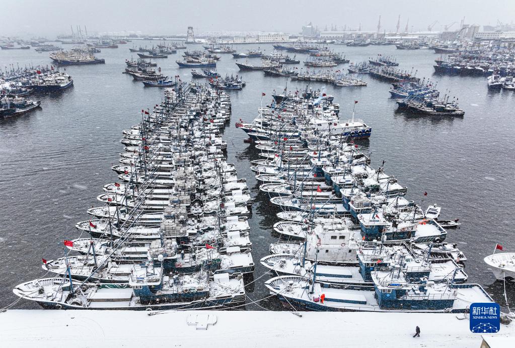 受強冷空氣影響,山東省榮成市近日出現大風(fēng)降雪天氣。出海作業(yè)漁船紛紛??繚O港,躲避寒潮、風(fēng)雪。