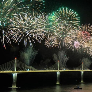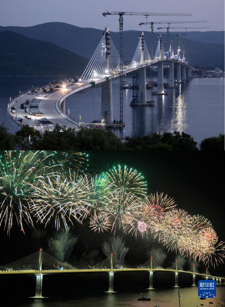 下圖:這是2022年7月26日在克羅地亞科馬爾納拍攝的佩列沙茨大橋通車(chē)儀式上的焰火表演。新華社記者 李學(xué)軍 攝