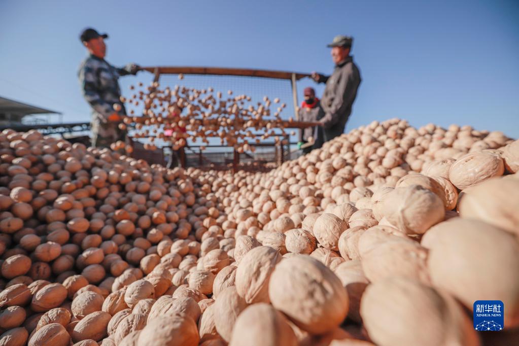 12月23日,農民在遵化市東舊寨鎮石橋頭村一家核桃專(zhuān)業(yè)合作社的場(chǎng)院篩核桃。
