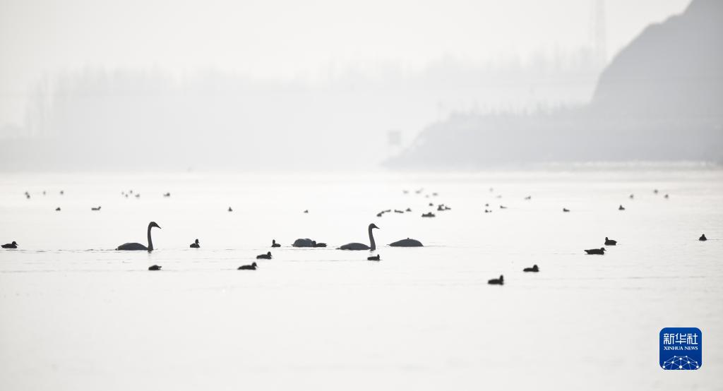 12月23日,大天鵝在青海省化隆回族自治縣群科鎮的黃河水面上休憩覓食。