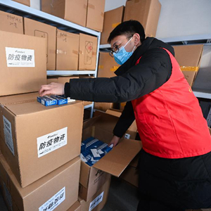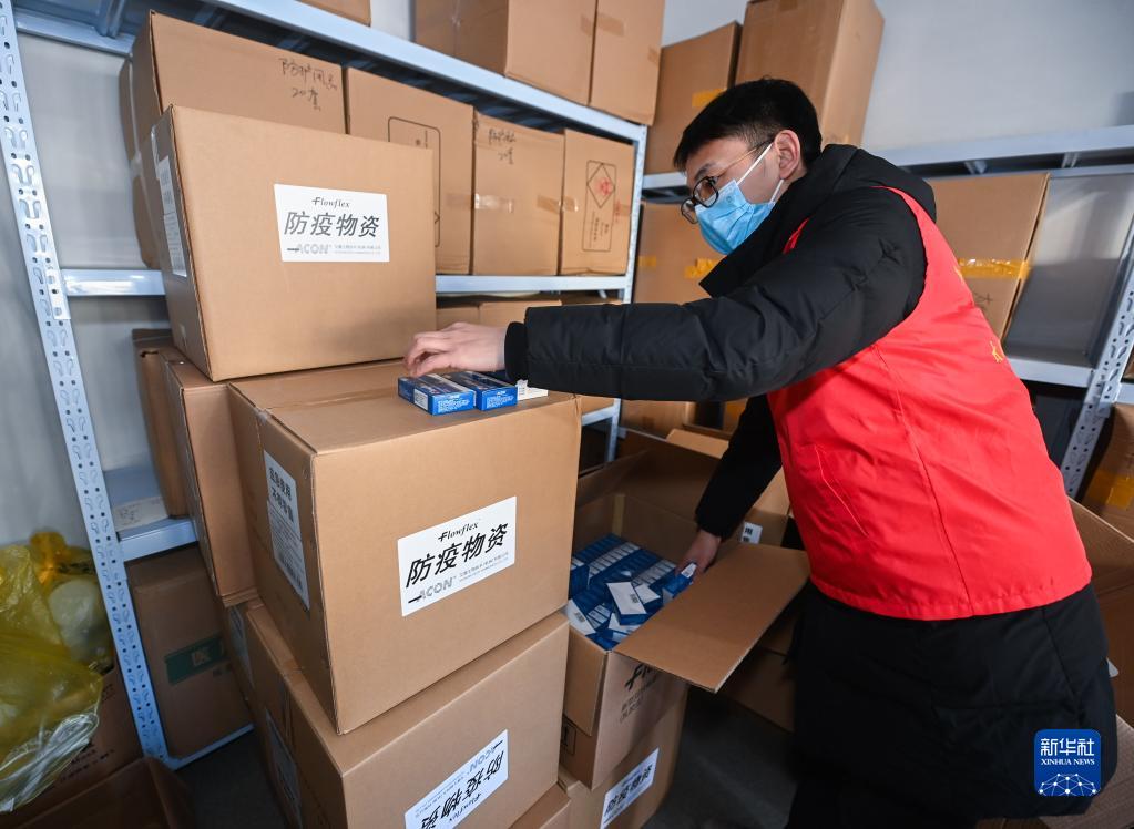 12月23日,在杭州市臨安區太湖源鎮黨群服務(wù)中心,黨員志愿者在揀選消毒液、口罩、必備藥品等準備裝入健康禮包。
