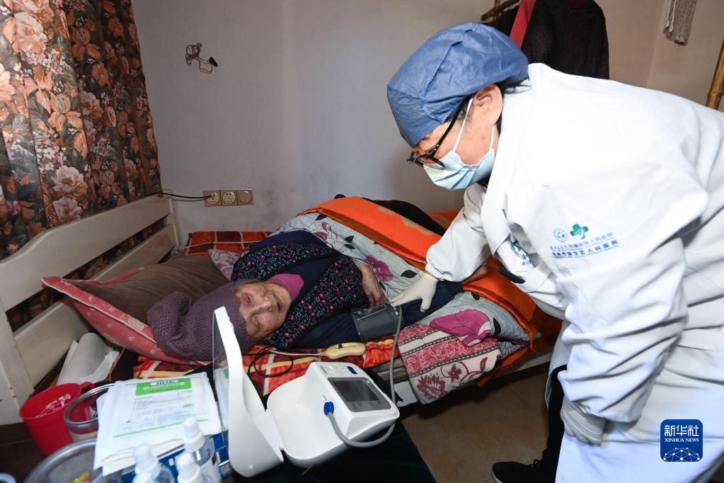 12月23日,在杭州市臨安區太湖源鎮青云村,太湖源鎮衛生院的家庭醫生上門(mén)為101歲的吳根花老人進(jìn)行體檢并送上健康禮包。