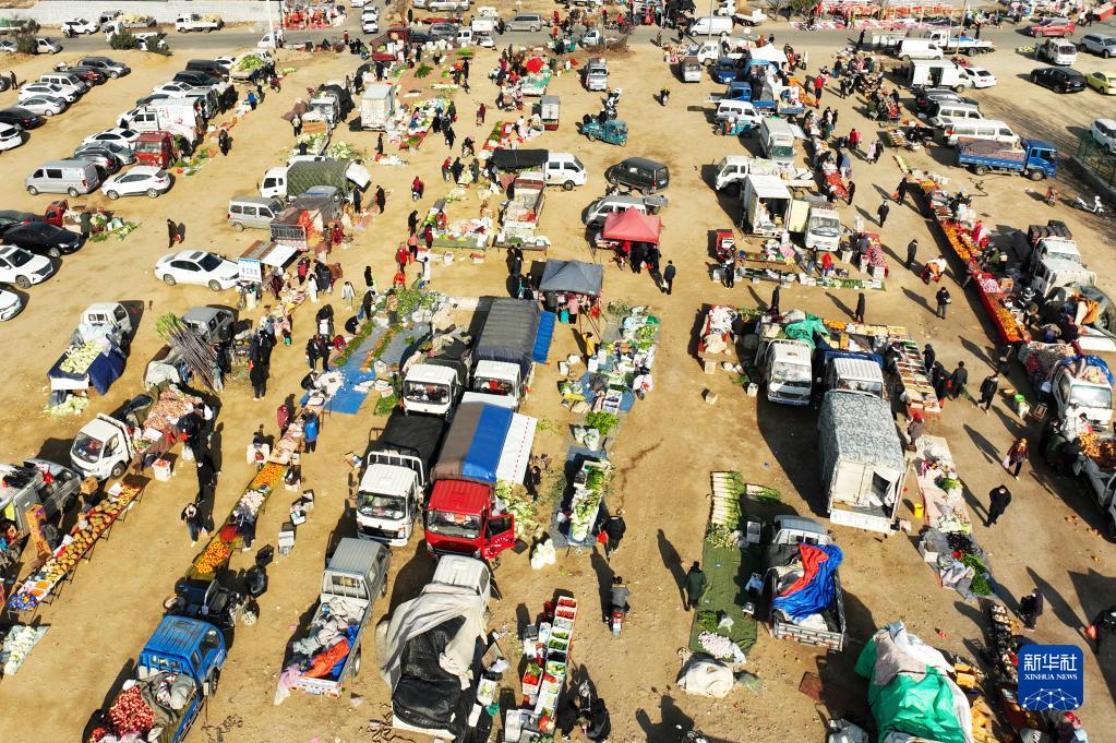 12月24日,在山東省青島市城陽(yáng)區流亭街道雙埠社區拍攝的年貨大集(無(wú)人機照片)。