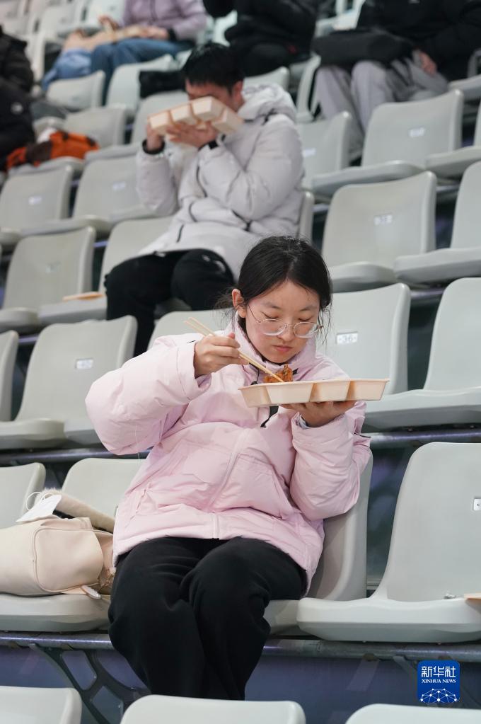 12月24日,在西安電子科技大學(xué)考點(diǎn),考生在體育館內分散就餐。