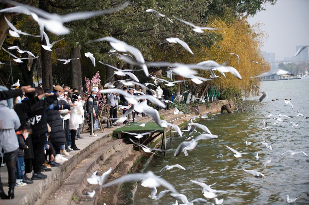 12月24日,游客在昆明滇池海埂公園里喂紅嘴鷗。