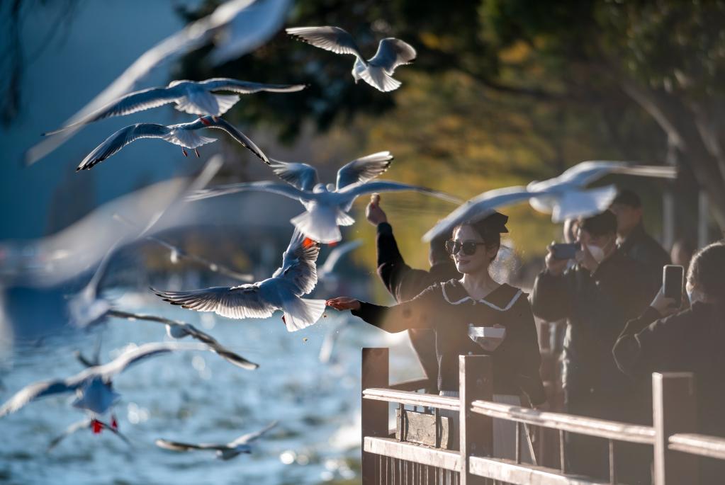 12月23日,游客在昆明滇池海埂公園里喂紅嘴鷗。