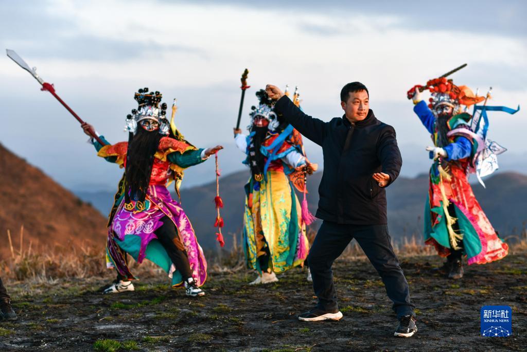 2022年2月7日,在貴州省黔南布依族苗族自治州龍里縣龍山鎮,“龍里太平花燈”藝人劉江(前)在村附近的山頂上指導年輕人練習花燈戲?!褒埨锾交簟笔橇鱾饔谫F州省龍里縣龍山鎮的一種古老戲曲劇種,在當地政府的保護與支持下,已傳承發(fā)展出“生旦凈丑”劇唱、臺上臺下互動(dòng)表演等多種表演形式。