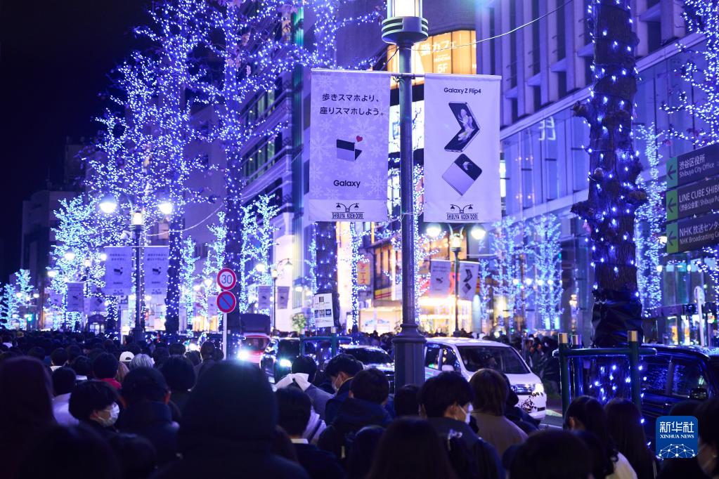 這是12月25日在日本東京澀谷一條街道上拍攝的燈光裝飾。年末將近,東京多地點(diǎn)亮燈光辭舊迎新。新華社記者 張笑宇 攝