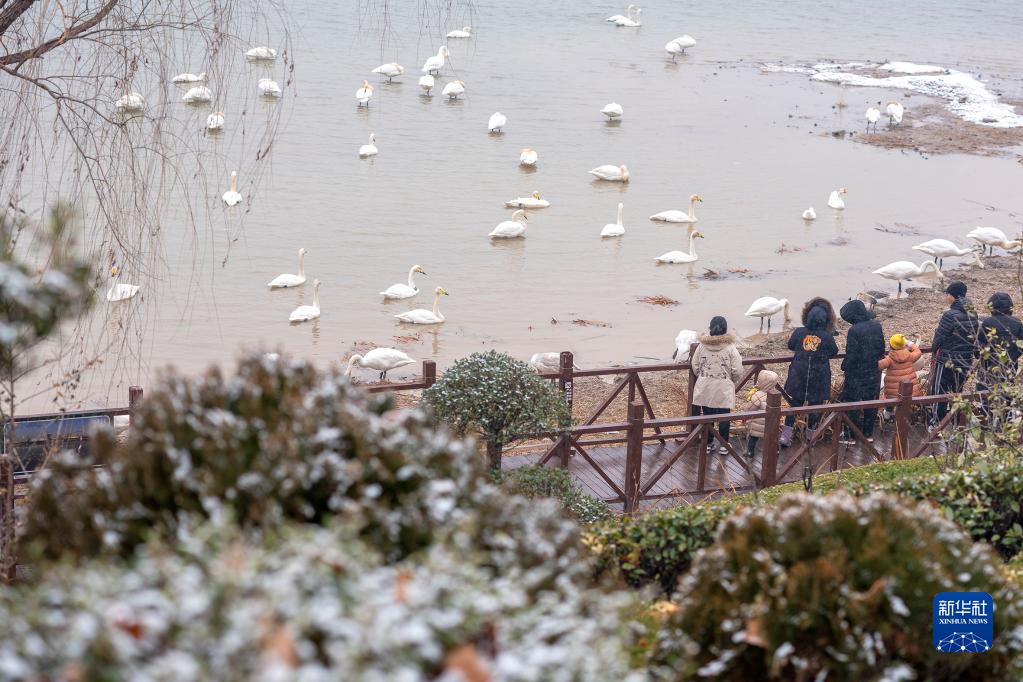 日前,河南三門(mén)峽天鵝湖國家城市濕地公園迎來(lái)小雪。白天鵝在雪中游弋,與冬景相映成趣。