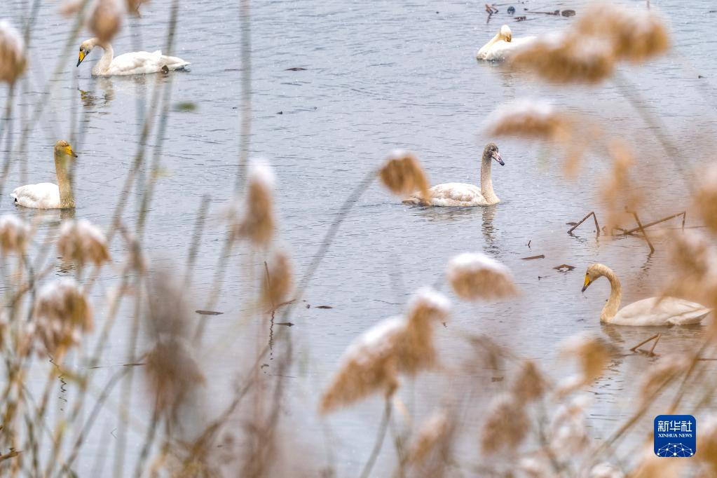 日前,河南三門(mén)峽天鵝湖國家城市濕地公園迎來(lái)小雪。白天鵝在雪中游弋,與冬景相映成趣。