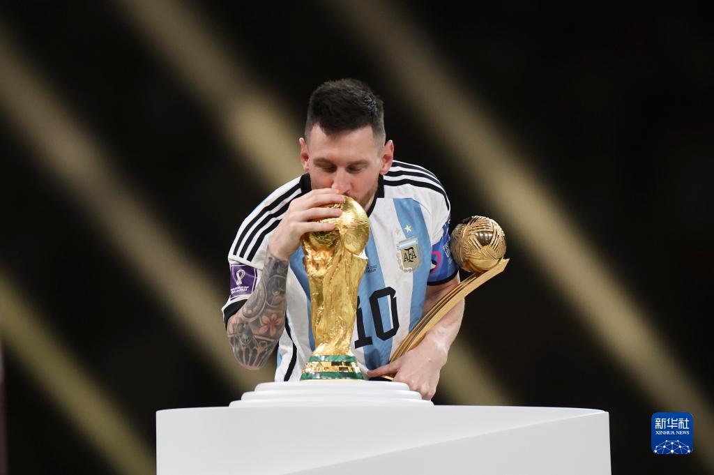 這是2022年12月18日,獲得世界杯金球獎的阿根廷隊球員梅西在卡塔爾世界杯足球賽頒獎儀式上親吻大力神杯。
