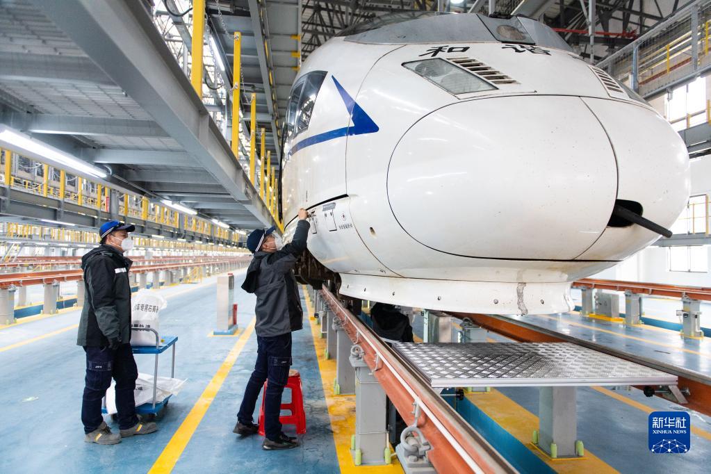 12月26日,工作人員在渝廈高鐵長(cháng)沙西動(dòng)車(chē)運用所6線(xiàn)檢查庫對停放的列車(chē)進(jìn)行保養。