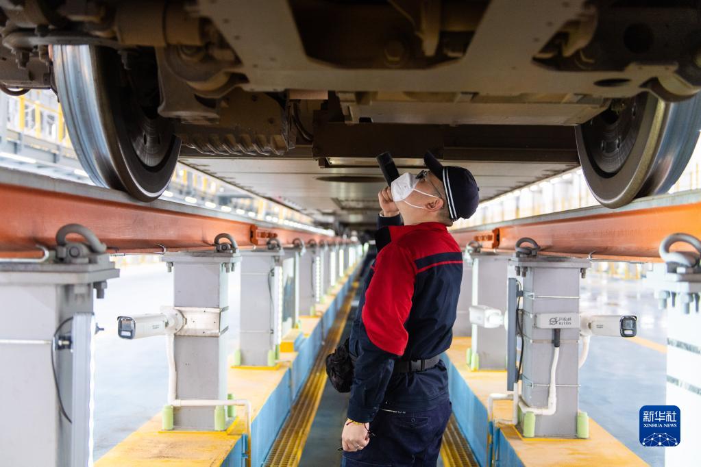 12月26日,工作人員在渝廈高鐵長(cháng)沙西動(dòng)車(chē)運用所6線(xiàn)檢查庫對停放的列車(chē)進(jìn)行檢修。