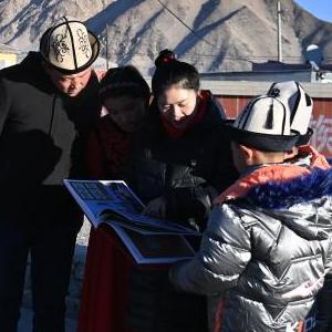 在新疆克孜勒蘇柯?tīng)柨俗巫灾沃莅⒖颂湛h布倫口鄉,李文娟(中)和同事們召開(kāi)專(zhuān)題討論會(huì ),學(xué)習黨的二十大精神(12月16日攝)。