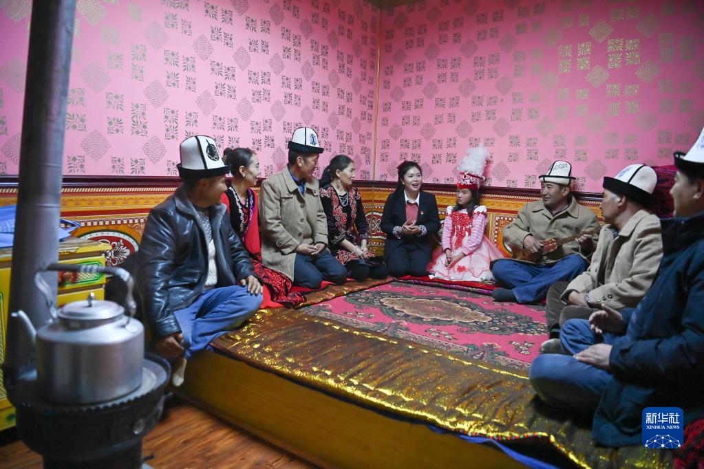 在新疆克孜勒蘇柯?tīng)柨俗巫灾沃莅⒖颂湛h布倫口鄉布倫口村,李文娟(中)在村民家中走訪(fǎng)(12月16日攝)。