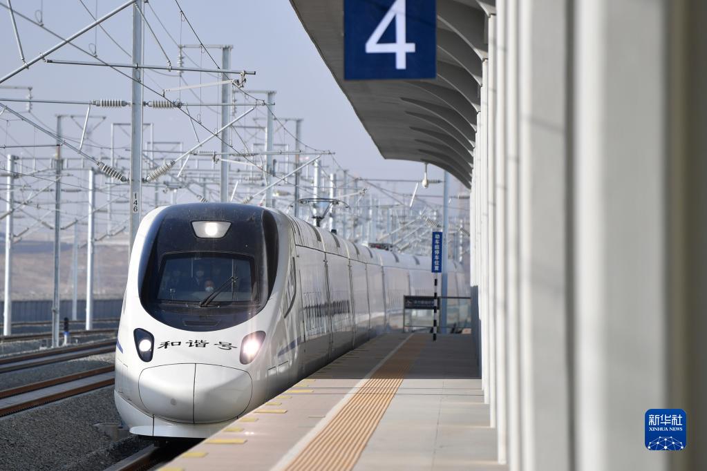 12月26日,一趟試運行動(dòng)車(chē)組列車(chē)駛入銀蘭高鐵秦王川站。