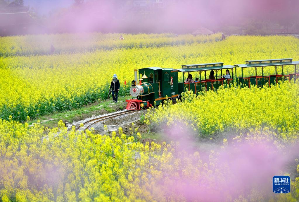 游客乘坐“小火車(chē)”在湖北省恩施土家族苗族自治州宣恩縣的油菜花田中欣賞春光(2022年3月18日攝)。