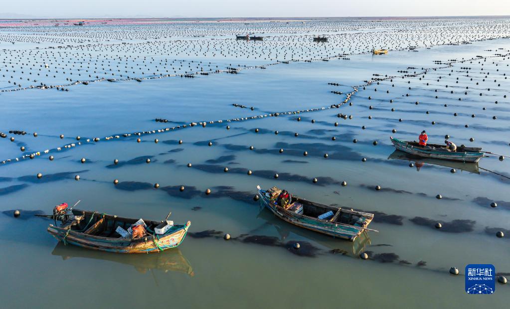 12月27日,在榮成市俚島灣海洋牧場(chǎng)海上養殖區,漁民駕駛漁船清理養殖筏架上的敷草(無(wú)人機照片)。