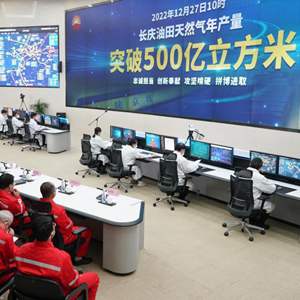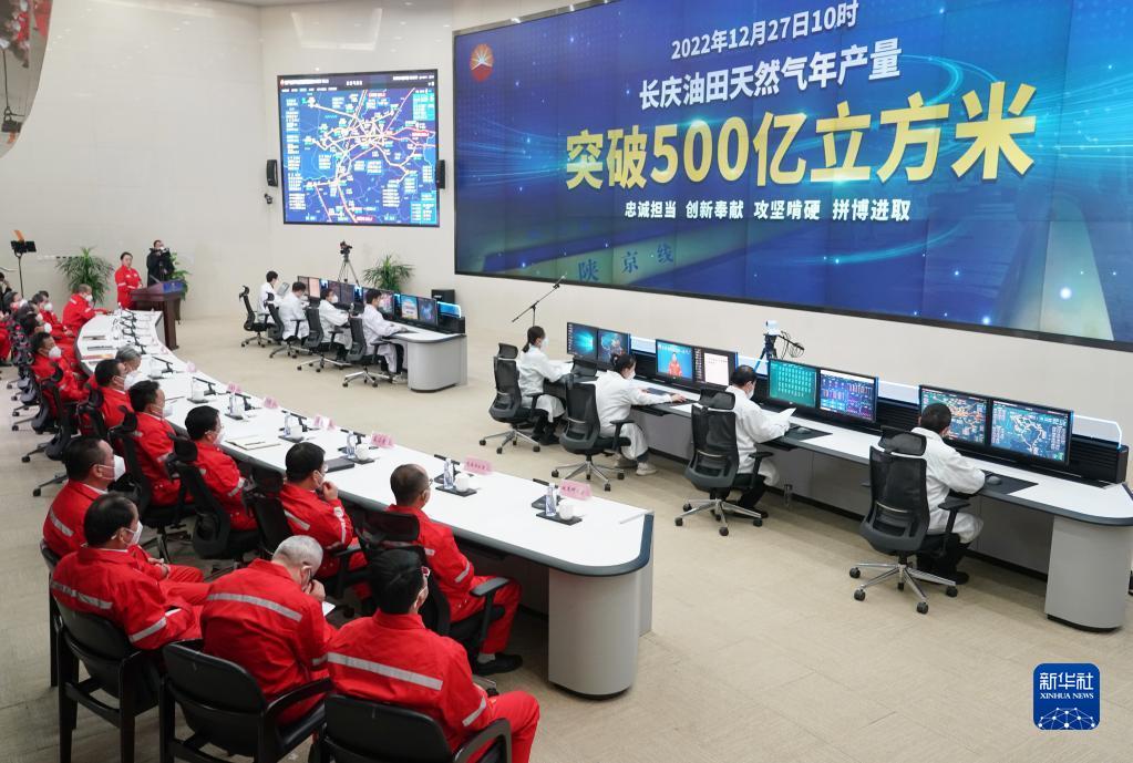 12月27日,在位于陜西西安的中國石油長(cháng)慶油田生產(chǎn)指揮中心內,電子屏上顯示天然氣年產(chǎn)量突破500億立方米。