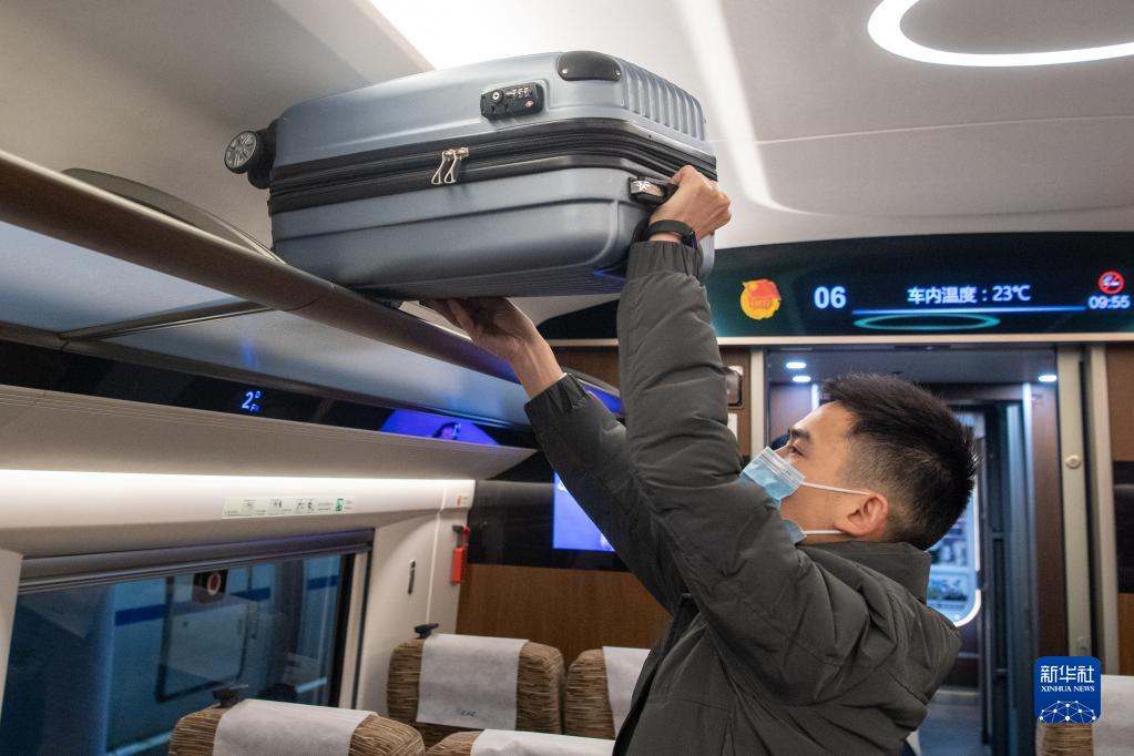 12月27日,在重慶北站即將發(fā)車(chē)的G8612次成渝城際高鐵“復興號”智能動(dòng)車(chē)組車(chē)廂內,乘客整理行李。