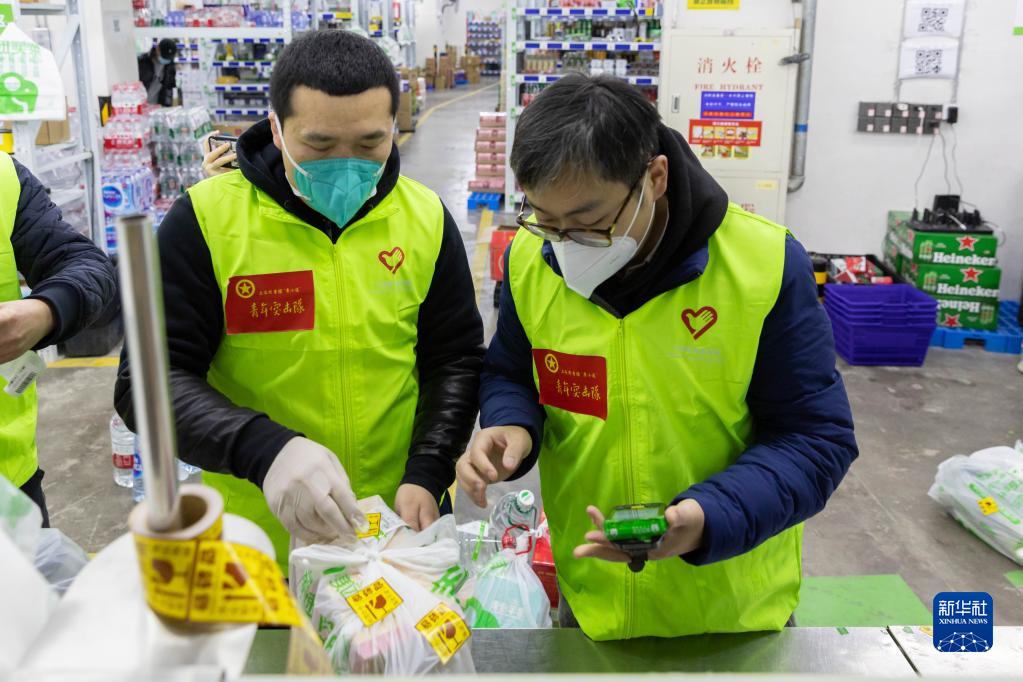 12月27日,在上海市徐匯區的美團買(mǎi)菜前置倉,青年突擊隊隊員將商品按照分類(lèi)要求進(jìn)行裝袋打包。