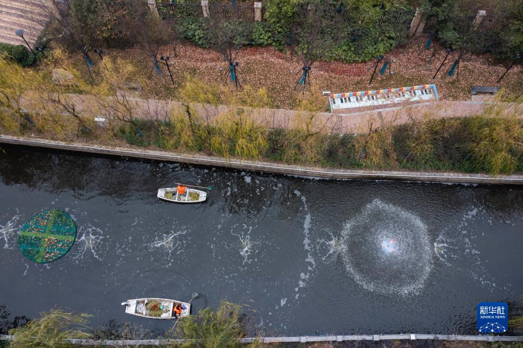 12月28日,龍泉街道的保潔人員在市陌河上清理漂浮物(無(wú)人機照片)。