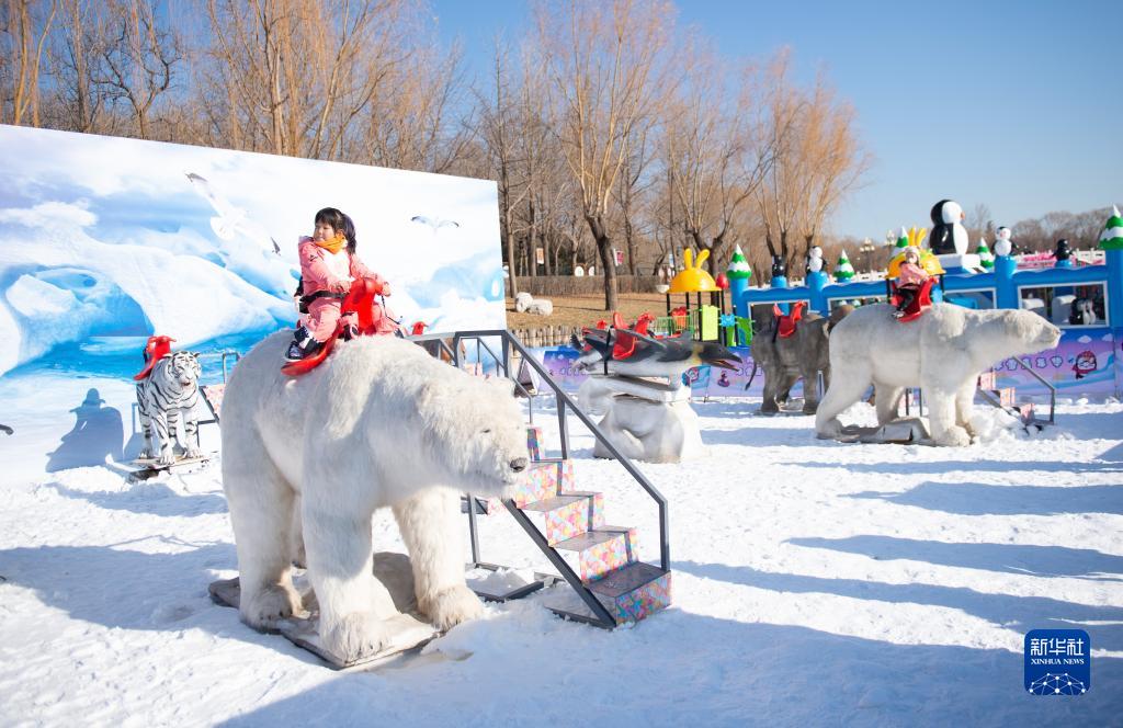 12月28日,小朋友在北京陶然亭公園騎“北極熊”。
