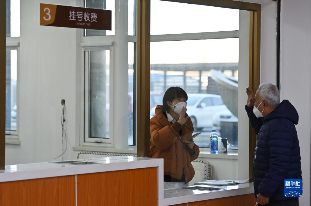 12月28日,在天津市西青醫院發(fā)熱門(mén)診擴展區,患者家屬向醫務(wù)人員咨詢(xún)住院登記事宜。