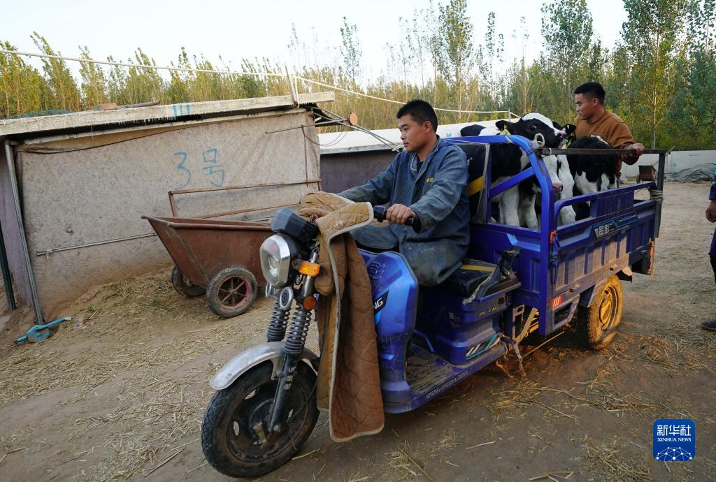 2022年10月19日,程鵬飛(左)和工人一起將剛買(mǎi)來(lái)的牛犢運到牛舍。