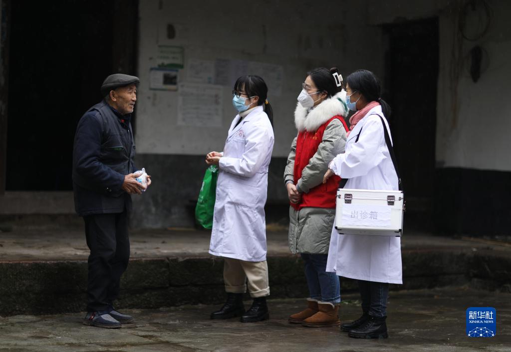 12月28日,在赤水市石堡鄉興農村,醫護人員和黨員志愿者為村民提供送藥上門(mén)服務(wù)。