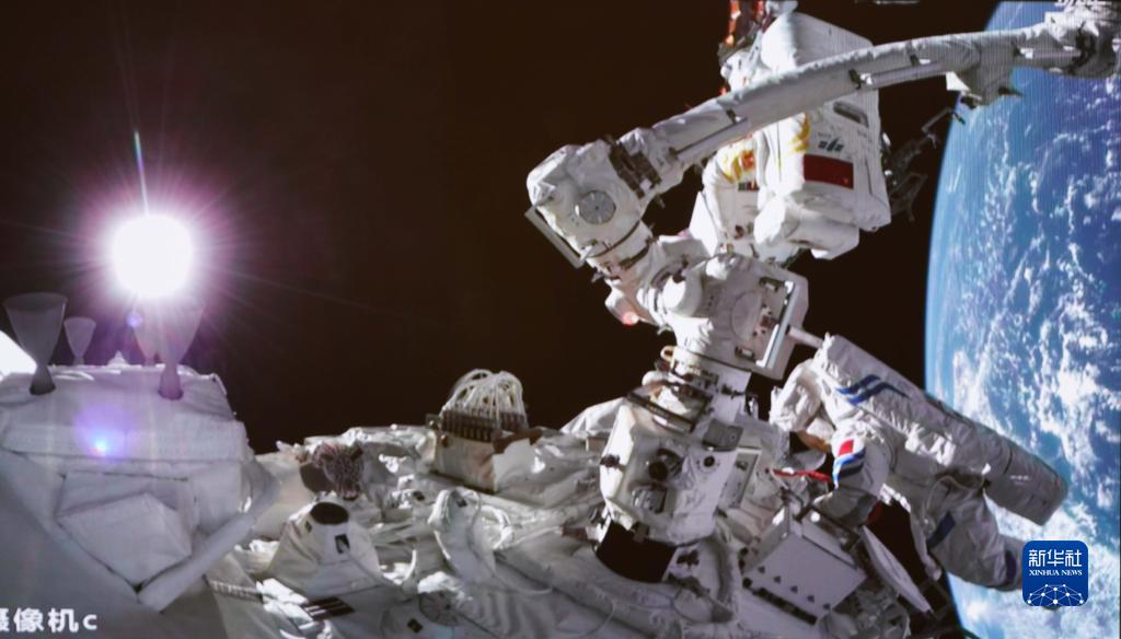 9月17日在北京航天飛行控制中心拍攝的神舟十四號航天員蔡旭哲(上)、陳冬(下)同時(shí)在艙外操作的畫(huà)面。據中國載人航天工程辦公室消息,當日13時(shí)35分,航天員蔡旭哲成功開(kāi)啟問(wèn)天實(shí)驗艙氣閘艙出艙艙門(mén)。新華社記者 郭中正 攝