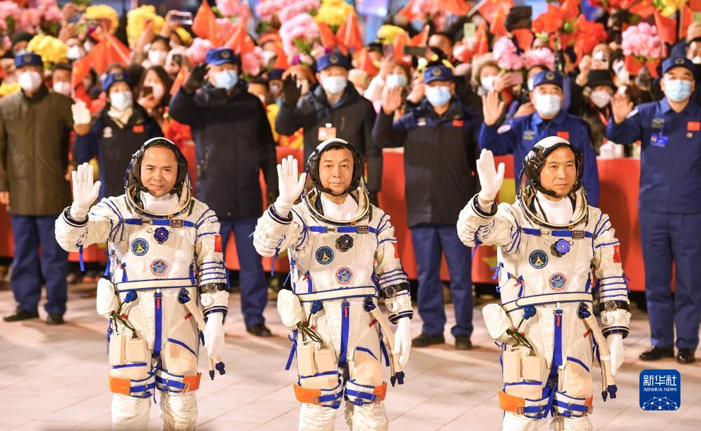 11月29日20時(shí)18分,神舟十五號載人飛行任務(wù)航天員乘組出征儀式在酒泉衛星發(fā)射中心問(wèn)天閣圓夢(mèng)園廣場(chǎng)舉行。航天員費俊龍(右)、鄧清明(中)、張陸在出征儀式上?!⌒氯A社記者 劉磊 攝