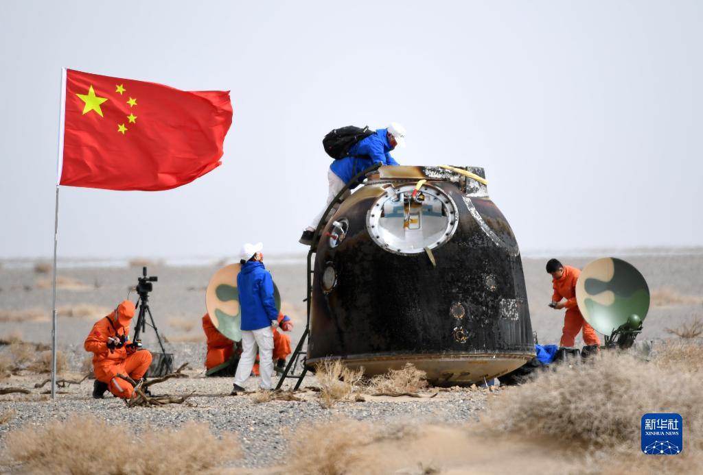 4月16日,神舟十三號載人飛船返回艙在東風(fēng)著(zhù)陸場(chǎng)預定區域成功著(zhù)陸?!⌒氯A社記者 彭源 攝