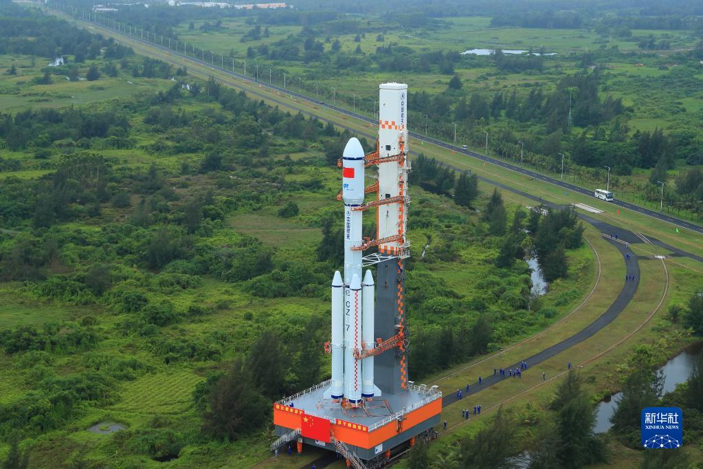 5月7日,天舟四號貨運飛船與長(cháng)征七號遙五運載火箭組合體在垂直轉運?!⌒氯A社發(fā)(楊志遠 攝)