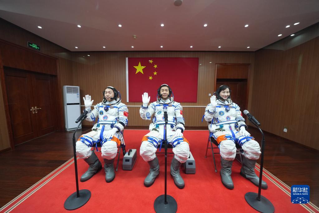 6月5日,神舟十四號載人飛行任務(wù)航天員乘組出征儀式在酒泉衛星發(fā)射中心舉行。陳冬(中)、劉洋(右)、蔡旭哲即將開(kāi)啟為期6個(gè)月的飛行任務(wù)?!⌒氯A社記者 李剛 攝