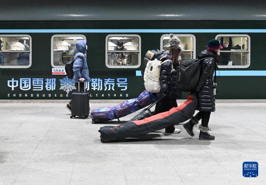 12月28日,在烏魯木齊站,旅客從Y965次“中國雪都·阿勒泰號”冰雪游旅客列車(chē)旁走過(guò)。