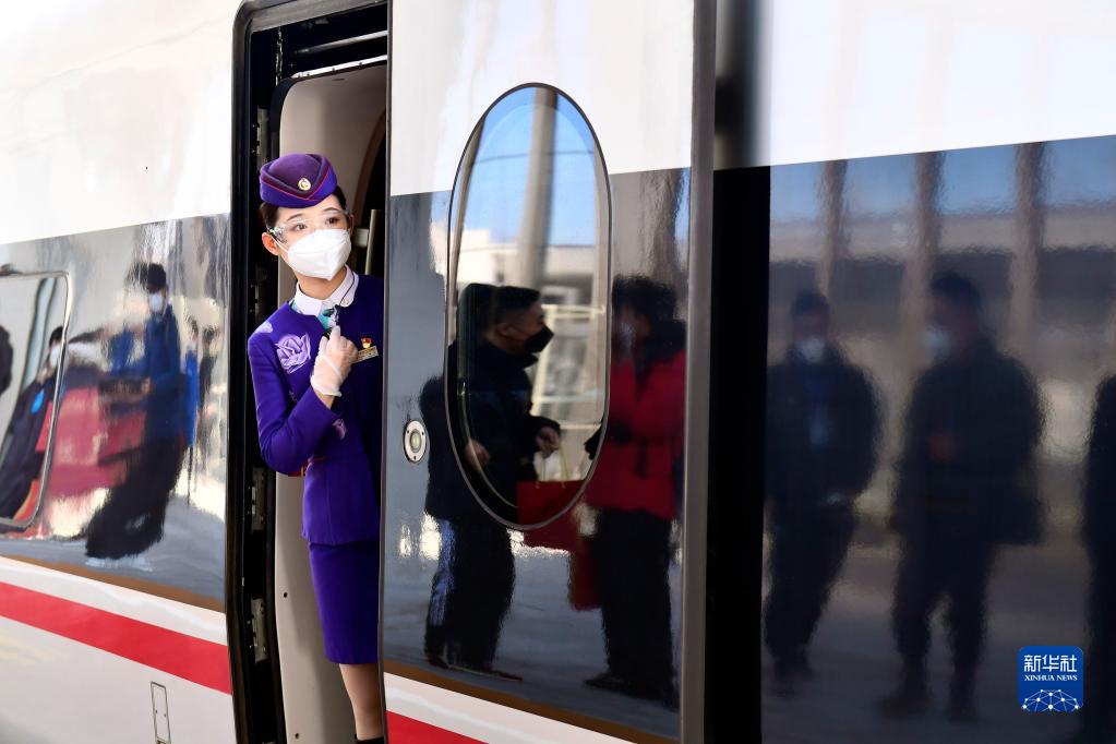 12月30日,在濟(南)萊(蕪)高鐵雪野站,乘務(wù)人員在車(chē)門(mén)處作業(yè)。