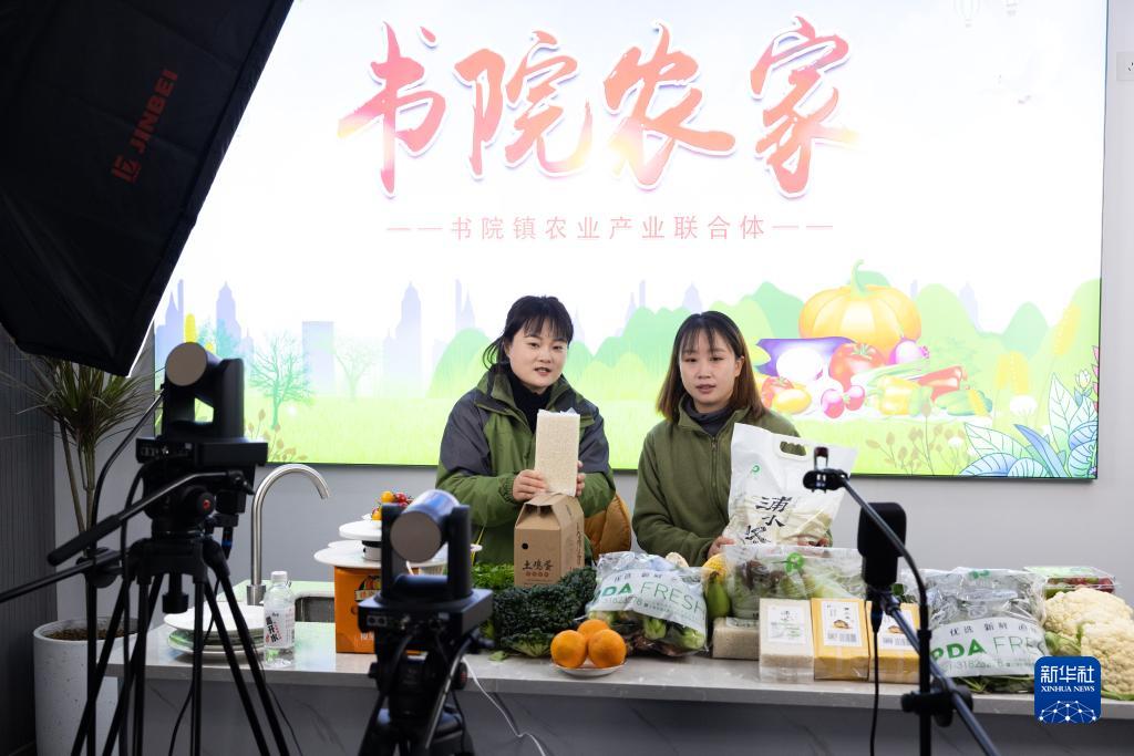 在浦東新區書(shū)院鎮,“書(shū)院農家”農業(yè)產(chǎn)業(yè)聯(lián)合體的兩位工作人員在直播帶貨(12月7日攝)。