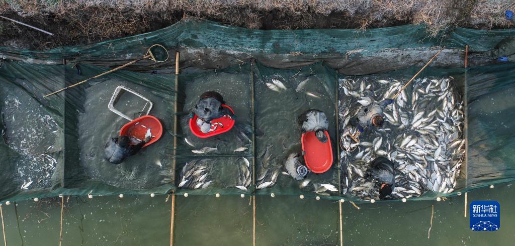 12月30日,江蘇淮安市淮安區流均鎮養殖戶(hù)在魚(yú)塘冬捕(無(wú)人機照片)。新華社發(fā)(趙啟瑞 攝)