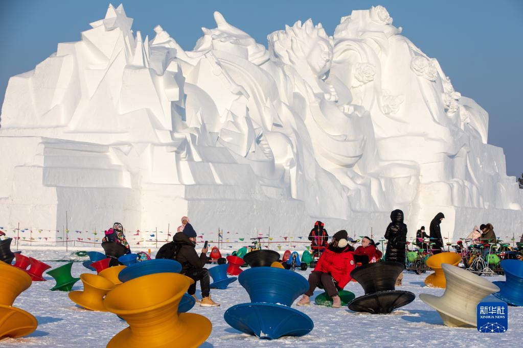 當日,許多市民和游客來(lái)到第35屆哈爾濱太陽(yáng)島國際雪雕藝術(shù)博覽會(huì )園區游玩,歡度元旦假期。