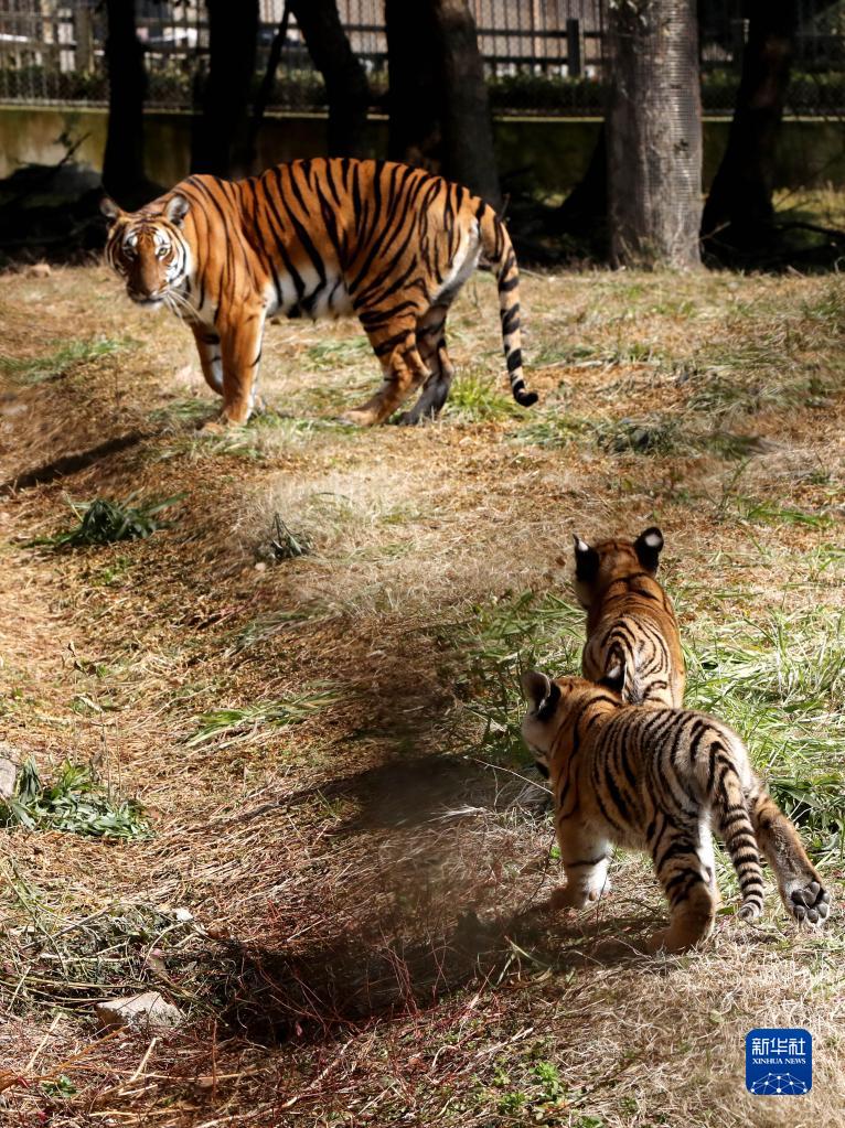 12月31日,在中國華南虎蘇州培育基地,雙胞胎小華南虎與虎媽媽在一起。